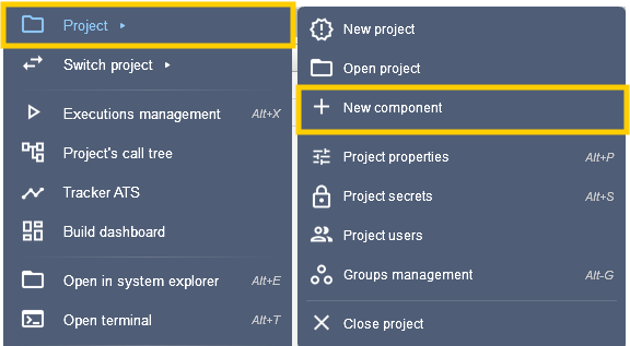 Pour créer un composant qui fera partie de votre projet, cliquez sur Projet > Nouveau composant