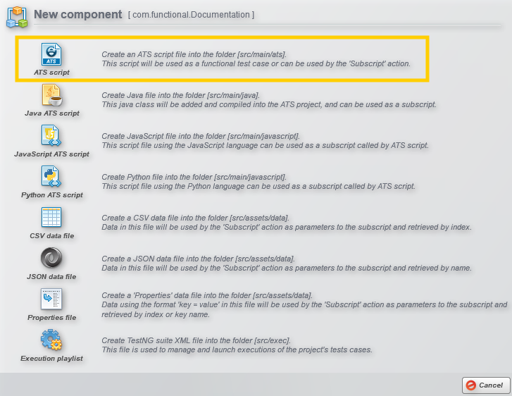 Lorsque vous créez un nouveau composant, Agilitest vous permet de sélectionner les types suivants :
