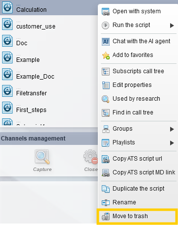 Vous pouvez supprimer votre script ATS en faisant un clic droit directement sur le script situé dans l'explorateur de projet.