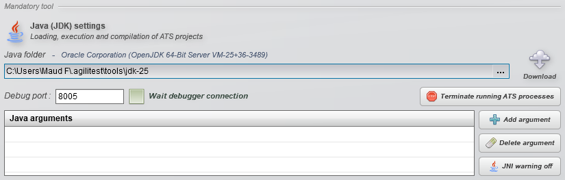 Vous devez disposer au minimum de la version 11 du JDK. Agilitest téléchargera la dernière version.