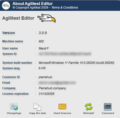 - Toutes les informations concernant votre machine connectée à Agilitest ainsi que votre licence