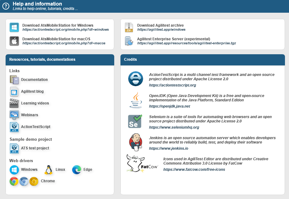 Vous trouverez également diverses ressources comprenant des liens vers la documentation d'Agilitest, son site web, des tutoriels, des pilotes web et une liste des intégrations compatibles avec Agilitest.